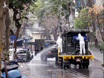 Bộ đội hóa học phun hóa chất tiêu tẩy khu vực phố Trúc Bạch, quận Ba Đình, nơi có nhà của bệnh nhân nhiễm SARS-CoV-2. Ảnh: TTXVN.