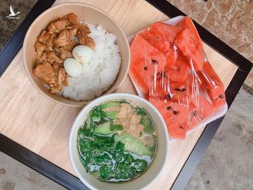 Ngày thứ 2, các suất cơm có thịt kho trứng, canh cua mồng tơi và dưa hấu.