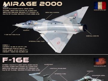 Cùng là loại máy bay chiến đấu của phương Tây, ra đời vào thời kỳ chiến tranh Lạnh, tiêm kích Mirage 2000 và F-16 Falcon đều được xếp vào loại chiến đấu cơ hạng nhẹ, một động cơ. Khi mới ra đời, cả hai chiến đấu cơ này đều ưu tiên cho nhiệm vụ chiếm ưu thế trên không, trước các máy bay của Liên Xô.Chiến đấu cơ Mirage 2000 cũng là chiến đấu cơ thế hệ 4 đầu tiên của châu Âu và nhờ loại máy bay chiến đấu này, thế giới còn nhớ về châu Âu, một thời cũng từng là trung tâm thiết kế và chế tạo máy bay chiến đấu hàng đầu thế giới; nhưng đã bị “chìm nghỉm” trong cuộc chạy đua vũ trang Xô – Mỹ.Như đã đề cập ở trên, khởi đầu F-16 và máy bay Mirage 2000 đều là những chiến đấu cơ hạng nhẹ, ưu tiên cho nhiệm vụ chiếm ưu thế trên không. Nhưng sau này, trước xu thế phát triển, những máy bay này đều được cải tiến, nâng cấp và thực hiện đa nhiệmvụ. Tuy cùng là máy bay chiến đấu có nguồn gốc phương Tây, nhưng loại chiến đấu cơ nào ưu việt hơn?Chiến đấu cơ Mirage 2000 do Dassault Aviation sản xuất, đây là thiết kế sử dụng cánh tam giác (cánh Delta) điển hình của châu Âu. Về tốc độ, có thể đạt tối đa lên tới Mach 2,2 (tương đương 2.336 km/giờ) ở độ cao lớn, hoặc có thể đạt tới 1.110 km/giờ ở độ cao thấp.F-16 do General Dynamics (hiện là Lockheed Martin) sản xuất, có tốc độ chậm hơn một chút so với Mirage 2000, F-16 chỉ có thể đạt tốc độ trên Mach 2 một chút (2.120 km/giờ); nhưng bù lại, F-16 hơn hẳn Mirage 2000 về khả năng tiết kiệm nhiên liệu.Về vũ khí, tiêm kích Mirage 2000 có tới 9 điểm cứng để lắp vũ khí và phạm vi chiến đấu 1.850 km. Ngoài ra, Mirage 2000 còn được giao nhiệm vụ sử dụng vũ khí hạt nhân chiến thuật.Ngoài hai khẩu pháo ổ quay 30 mm DEFA 554, được sử dụng để không chiến tầm gần, Mirage 2000 còn trang bị 2 thùng tên lửa không điều khiển Matra 68 mm (một thùng có sức chứa 18 quả), để tiến công các mục tiêu mặt đất. Ngoài ra, chiến đấu cơ Mirage 2000 còn có khả năng phóng nhiều loại tên lửa đối không và đối đất do Pháp chế tạo.Về tốc độ leo cao, Mirage thắng F-16 trong trường hợp này. Trong khi Mirage có tốc độ leo tối đa 285 m/s, thì F-16 chỉ đạt 220 m/s; nếu so sánh kích thước của hai loại máy bay này sẽ giải thích tất cả.Mirage có trọng lượng rỗng là 7.500 kg và có tổng trọng lượng cất cánh là 17.000 kg; trong khi F-16 có trọng lượng rỗng là 8.570 kg, với trọng lượng cất cánh tối đa là 19.200 kg. Chiếc Mirage 2000 có thể chạm độ cao tối đa 18 km, trong khi trần bay tối đa của F-16 là 15 km.Về bán kính chiến đấu, theo nhà sản xuất Lockheed Martin, phiên bản F-16C có bán kính chiến đấu lên tới 1.370 km, với hai quả bom nặng khoảng 907 kg mỗi quả; trong khi Mirage có bán kính chiến đấu 1.475 km với bốn quả bom 250 kg. Như vậy bán kính hoạt động của F-16 tốt hơn Mirage 2000 rất nhiều.Về khả năng chiến đấu, Mirage 2000 chủ yếu được biết đến với khả năng thực hiện các hoạt động tiến công mặt đất. Một chiếc Mirage 2000, có thể mang ít nhất hai quả bom dẫn đường bằng laser, có khả năng tiêu diệt chính xác các mục tiêu chính trên mặt đất.Tuy nhiên, với khả năng mang tải vũ khí tương đối lớn, cũng như nhờ có những cải tiến, nâng cấp mạnh, nên Mirage 2000 có thể thực hiện tốt cả nhiệm vụ đối không. Điểm yếu là Mirage 2000, chỉ có thể sử dụng những vũ khí do Pháp chế tạo, điều này cũng làm hạn chế khả năng của loại chiến đấu cơ này.F-16 phù hợp hơn với các cuộc không chiến, do khả năng cơ động cao và khả năng chịu tải của F-16 tương đối tốt (đến 9g). Hơn nữa, buồng lái của F-16 được đánh giá cao, đây là buồng lái toàn bằng kính đầu tiên, ghế ngồi của cao, nên phi công có được tầm nhìn 360 độ, do đó cải thiện đáng kể độ chính xác.Tuy cùng là tiêm kích nhẹ, nhưng chi phí hoạt động của Mirage 2000 cao hơn F-16 rất nhiều. Cụ thể, hạ tầng mặt đất cho Mirage 2000 đắt gấp 3 lần F-16; tiêu hao lượng nhiên liệu cao gấp rưỡi, cho cùng một quãng đường bay hành trình.Kể từ khi chiếc F-16 đầu tiên cất cánh cách đây 45 năm, đã có 4.500 chiếc được chế tạo và khả năng chưa dừng lại, vì vẫn có nhu cầu; do vậy F-16 hết sức thành công về mặt doanh thu. Trong khi đó, chỉ có khoảng hơn 600 chiếc Mirage 2000 được chế tạo và Pháp đã dừng sản xuất loại máy bay này, từ năm 2003 vì không tìm được khách hàng.